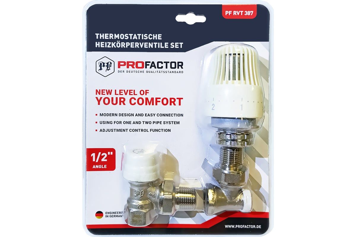 Комплект радиатора PROFACTOR термостатический, угловой, 1/2 PF RVT 387 предназначен для подключения отопительных приборов и плавного регулирования теплового режима в помещении за счет изменения расхода теплоносителя в отопительных системах, может использоваться в однотрубных и двухтрубных системах отопления.