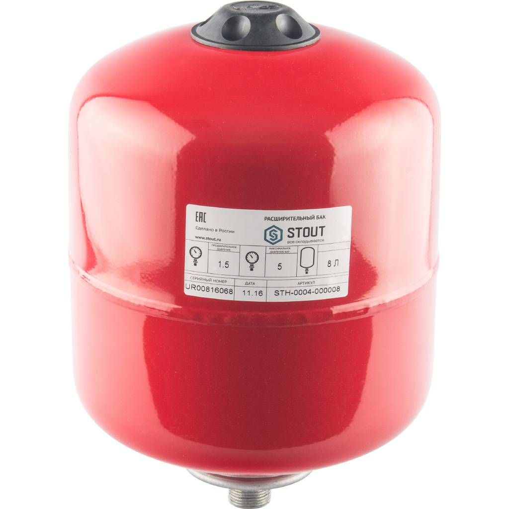 Расширительный бак 8 л STOUT STH-0004-000008 используется для компенсации температурного расширения в системе и стабилизации давления, сглаживания колебаний давления и компенсации гидравлических ударов в системах отопления с температурой теплоносителя до 100ºС.